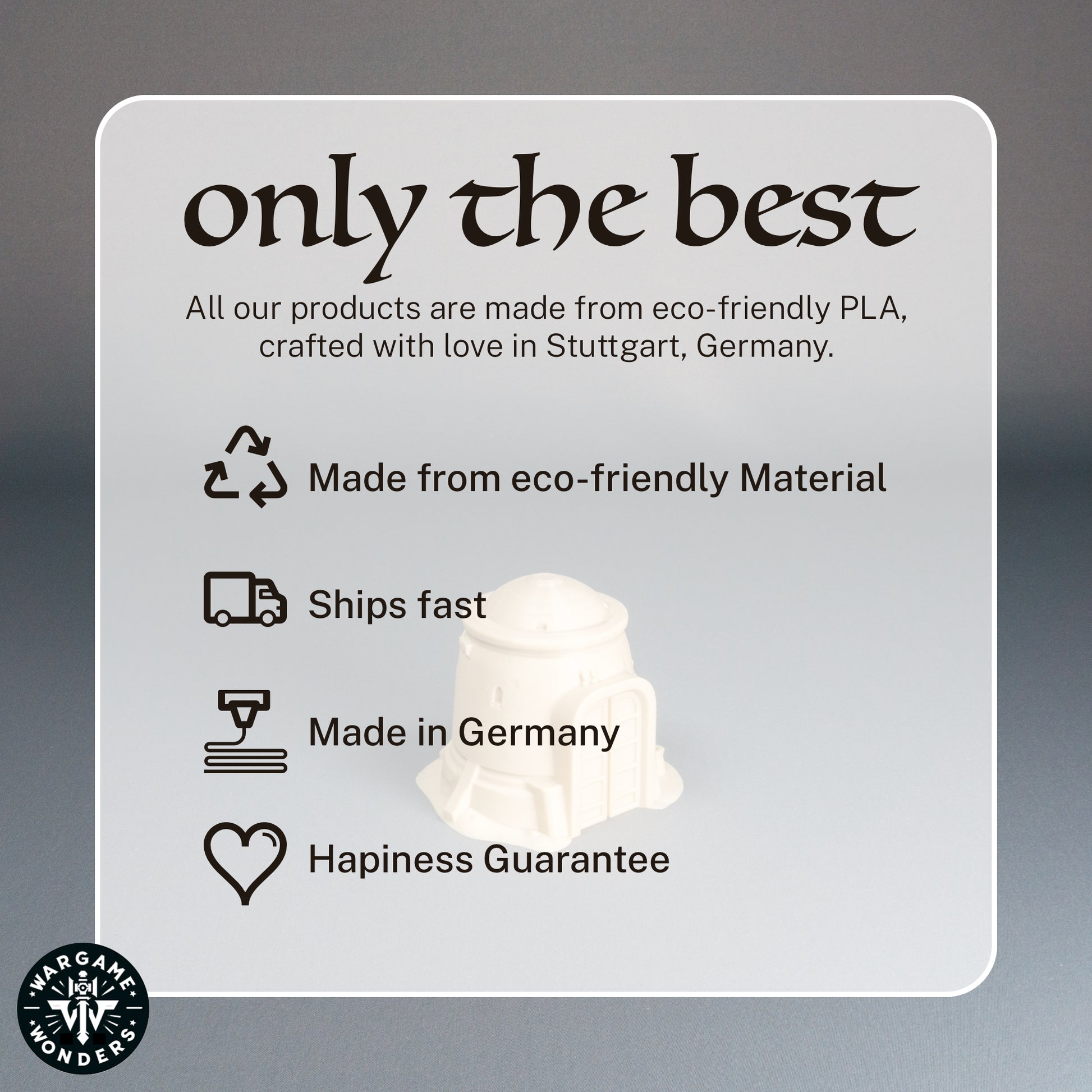 Wir fertigen unsere 3D-Druckprodukte mit größter Leidenschaft und Präzision – und geben nur das weiter, womit wir selbst Freude hätten. Jedes Modell wird sorgfältig geprüft, um sicherzustellen, dass es unseren hohen Erwartungen entspricht. Solltest du dennoch nicht zufrieden sein, bieten wir eine einfache Rückgabe an. Deine Begeisterung für unsere Produkte ist unser Antrieb.